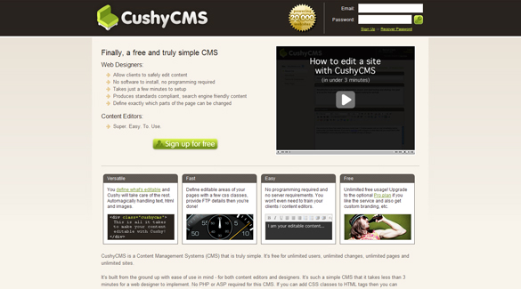 Cushy CMS, kullanım kolaylığında en iddialı içerik yönetim sistemlerinin başında geliyor. Sistemin kullanılması için PHP ve ASP’ye gerek olmaması, kurulumun bir kaç dakikada tamamlanması ve içeriğin kolayca düzenlenmesi Cushy CMS’in en büyük artılarından. Ayrıntılı bilgi ve ücretsiz olarak kullanmaya başlamak için resmi sitesi>>