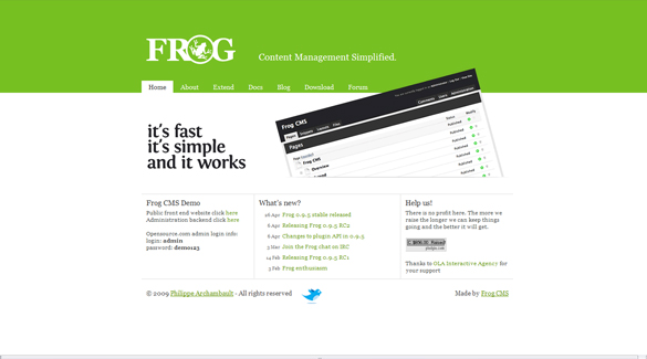 “Hızlı, kolay ve işe yarar” sloganı ile yola çıkan Frog CMS, 2007 yılından bu yana kullanılan açık kaynak kodlu ve PHP tabanlı bir içerik yönetim sistemi. Basit yapılı siteler oluşturmak için ideal görünüyor. Sitesindeki Dökümanlar sayfasında, kullanımıyla ilgili her şey bütün detaylarıyla anlatılmış.