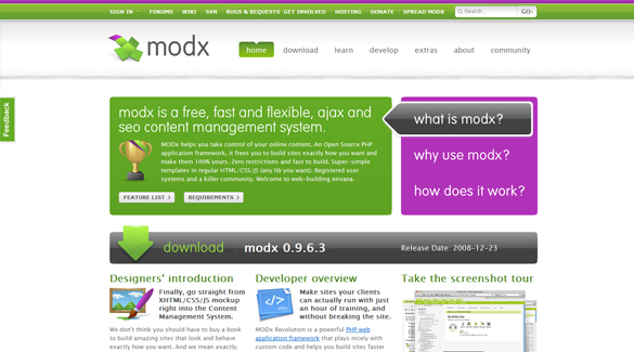 MODx, Ajax ve SEO uyumlu hızlı, basit ve esnek bir CMS. Html, CSS ve Javascript destekli sayfaları düzenleyerek, süper şık ve profesyonel siteler oluşturabileceğiniz esnek bir yapıya sahip. Güzelliği kendi sitesinden de belli zaten. Yine de denemeden kesin konuşmamak lazım. Sistem gereksinimlerini General Requirements linkinden, bütün özelliklerini ise Features linkinden görebilirsiniz.
