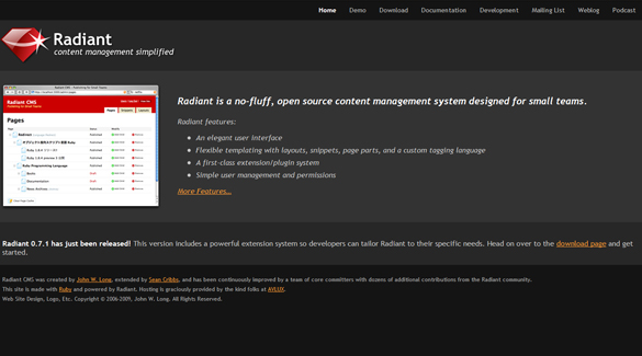 Radiant CMS, çok gelişmiş olmayan sade siteler için kullanımı ve düzenlenmesi kolay bir CMS hizmeti sunuyor. Kendi bünyesindeki özellikler ve resmi sitesindeki hazır eklentiler ile istediğiniz gibi geliştirebileceğiniz esnek bir yapıya sahip olduğu söyleniyor. Denemek isterseniz DEMO linki>>