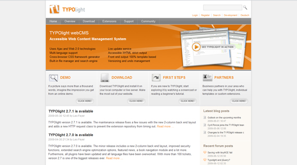 TYPOlight CMS için, Typo3’ün hafifletilmiş ve basitleştirilmiş hali diyebilirim. Ajax ve Web 2.0 teknolojilerini de içeren genel yapısında Haberler, Takvim ve Formlar gibi bir çok hazır modül de yer alıyor. TYPOlight’ı diğerlerinden ayrılan en büyük özelliği ise; çoklu blog (mutliple blog) şeklinde kullanılabilir olması. Bütün özelliklerini ve sistem gereksinimlerini incelemenizi tavsiye ederim. Online olarak denemek için DEMO linki>>