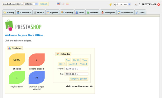 Prestashop’un sadece ön planda değil, arka planda da aynı derecede kullanışlı bir yapıya sahip olduğunu rahatlıkla söyleyebilirim. Ürün girişi ve düzenlemesi, sipariş yönetimi, kategori düzenlemesi, modül yönetimi gibi ayarları olan çok kolay ve kullanışlı bir yönetim paneli var.